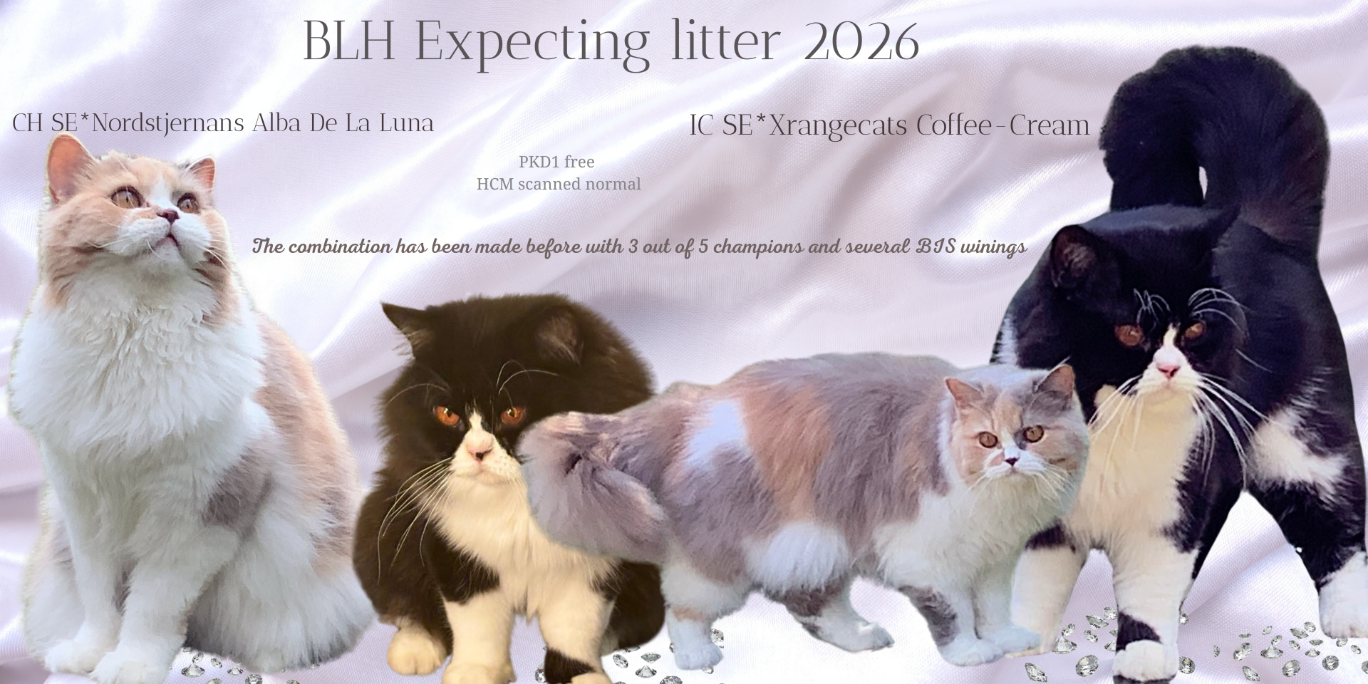 2026 bjuder på två spännande kullar på vårt katteri. Senvinter/vår hoppas vi att Alba och Coffee nedkommer med vår efterlängtade E-kull. Denna kull är en repris på vår fina C-kull som varit framgångsrik på utställningar i både Sverige och Belgien. Föräldrarna är skannade utan anmärkning på sina hjärtan flera gånger och genetiskt fria från ärftlig njursjukdom. Förväntade färger: Choklad, lila, creme, blå, svart med och utan vitt. A-blod